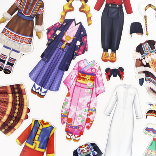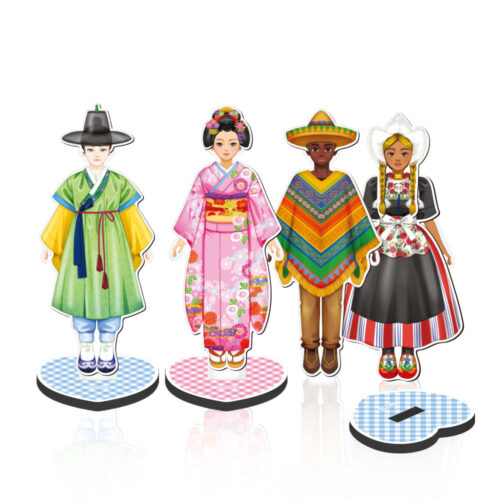 특징 : – 4인종 12개국 다문화 전통의상 역할 놀이 – 다문화 교육 최적화 교구 – 코디놀이를 통한 세계문화 학습 – 문화적 배경 이해와 문화 존중심 함양 – 타문화 존중을 통해 글로벌 사회 경쟁력 발달